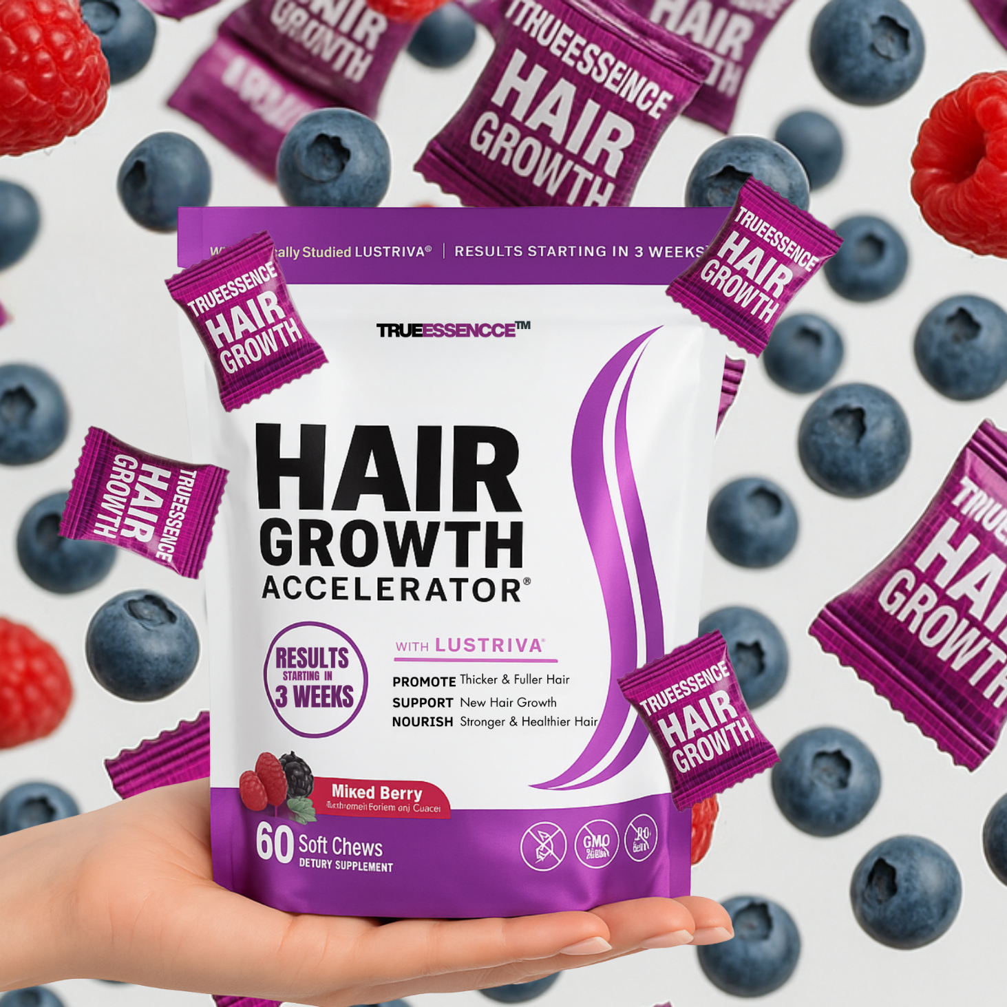 At Trueessencce, we believe every woman deserves hair that makes her feel unstoppable. Our Hair Growth Chews combine a clinically studied biotin complex with essential nutrients to strengthen roots, reduce shedding, and restore natural fullness. Backed by science and loved by women everywhere, it’s a simple daily ritual that helps bring your confidence back—one strand at a time.